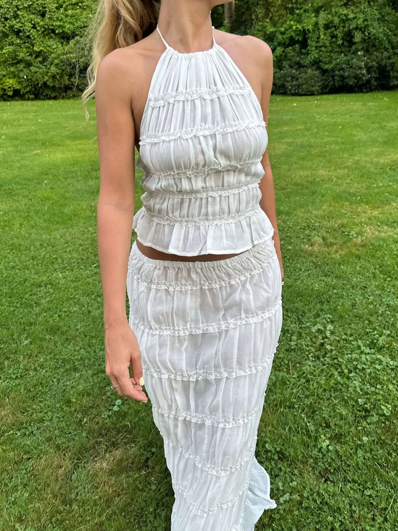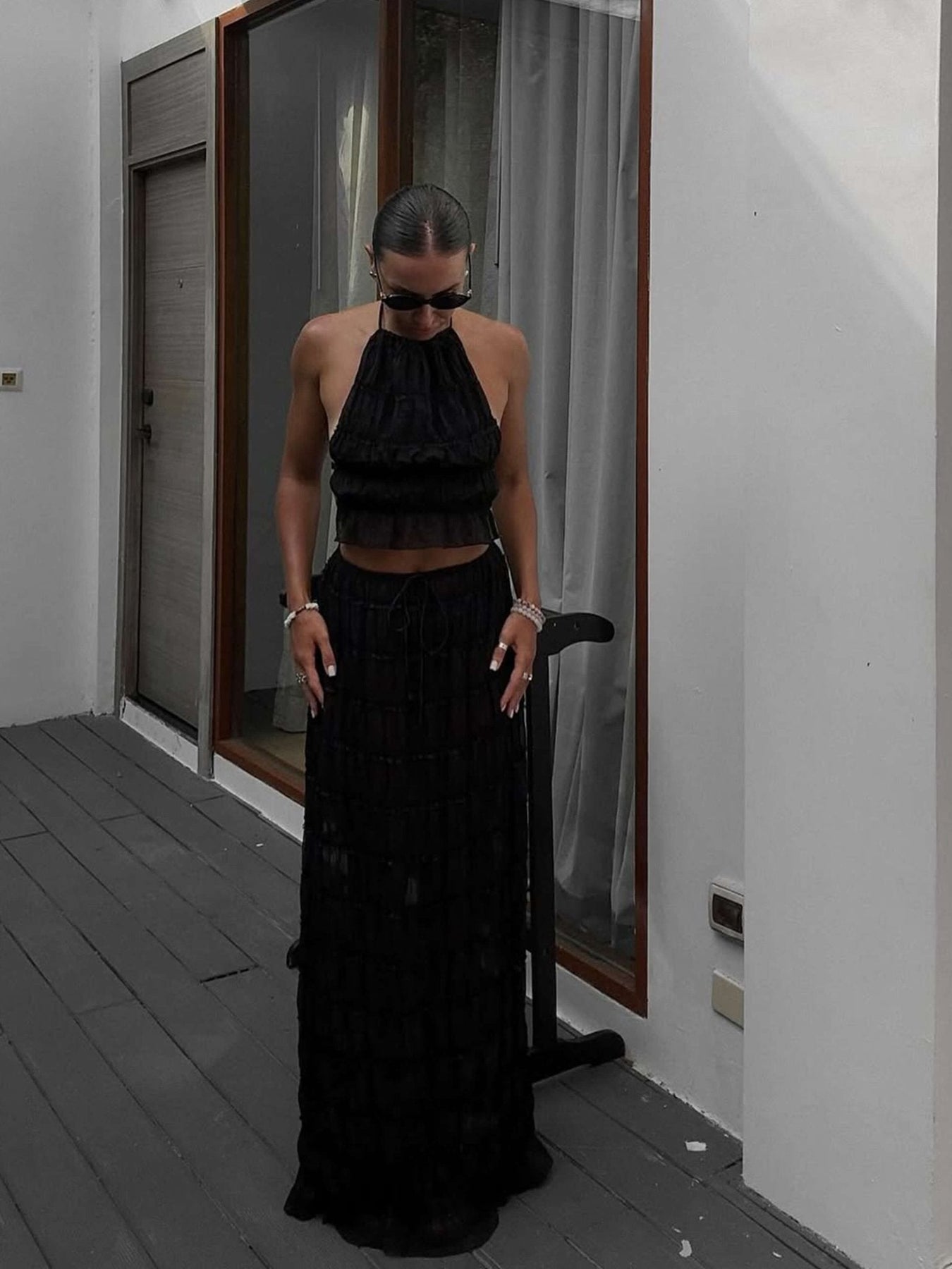 Valerie-setet i två delar är förkroppsligandet av feminin elegans. Med en mjuk, rynkad crop top med fina volanger och en matchande böljande maxikjol ger detta set en avslappnad charm till alla tillfällen. Den smickrande silhuetten och det lätta tyget gör det perfekt för bruncher, strandsemestrar eller varma sommarkvällar. Bär plaggen tillsammans för en drömlik, koordinerad look eller blanda dem med dina garderobsfavoriter för en mångsidig styling.