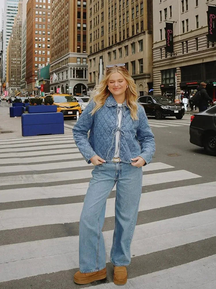 Vi presenterar den snygga Denim Grid Lapel Jacket, designad för den moderna kvinnan som värdesätter både mode och komfort. Detta eleganta ytterplagg har en unik volangdesign med snörning, vilket gör den perfekt för avslappnad gatukläder under höstsäsongen.