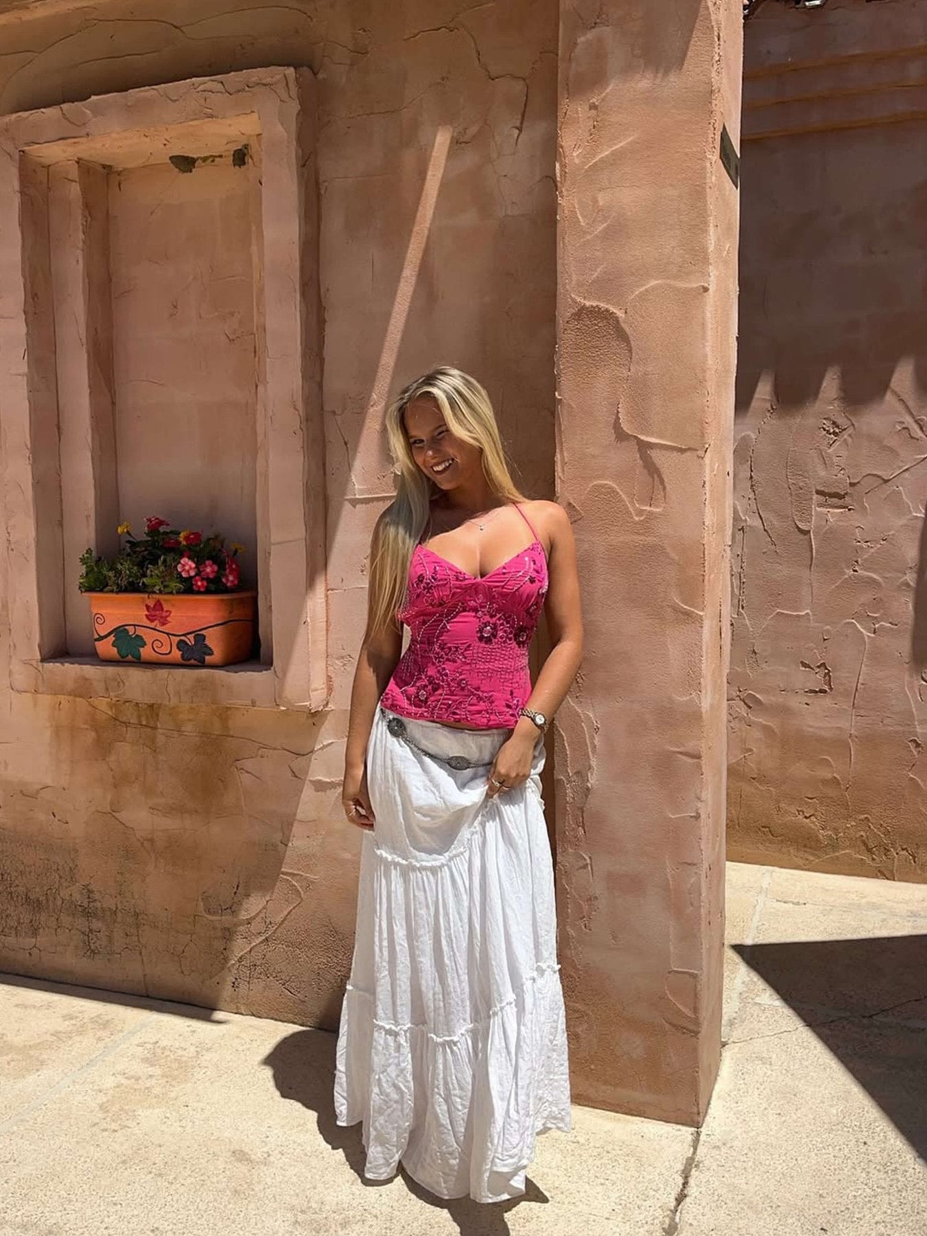 Shila-toppen kombinerar eleganta linjer och mjuka texturer för en självsäker men ändå graciös look. Med sin halterneckringning, åtsittande överdel och öppna rygg smickrar detta plagg din figur samtidigt som det ger ett djärvt uttalande. Tillverkad av ett bekvämt stretchtyg är den perfekt för utekvällar, speciella tillfällen eller som lager-på-lager-under-en-kavaj för en elegant kontrast.